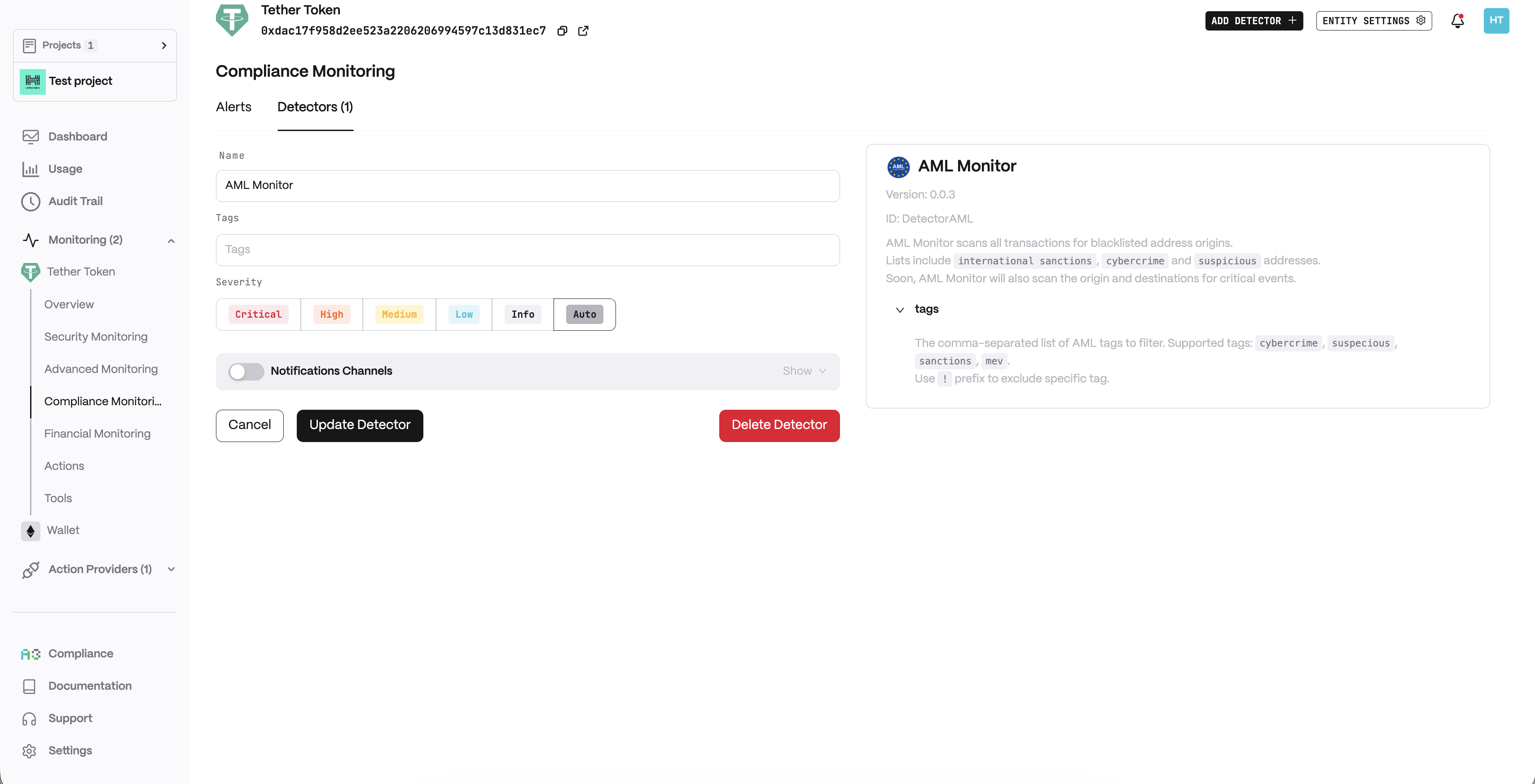 2. *Tags* - The comma-separated list of AML tags to filter. Supported tags: `cybercrime`, `suspicious`, `sanctions`, `mev`. Use `!` prefix to exclude specific tag.